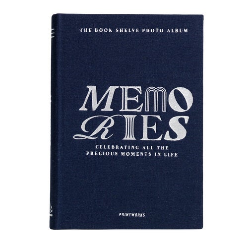 Oppdag Printworks' innovative fotobok, den perfekte følgesvenn i enhver bokhylle. Memories har et elegant mørkeblått linlignende omslag med hvit tekst, og er et stilig alternativ til tradisjonelle, kasseformede coffee table-album.