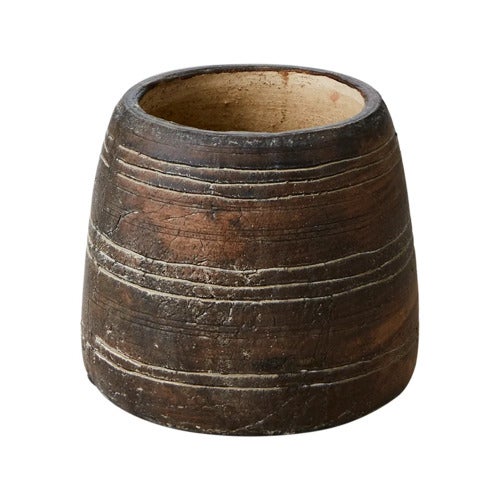 Brun terrakottapotte med en vakker, slitt patina som gir et autentisk antikt utseende. Inspirert av en tradisjonell indisk tremørtel har den karakteristiske striper og en rustikk overflate som skaper en naturlig, røff vintagestil.