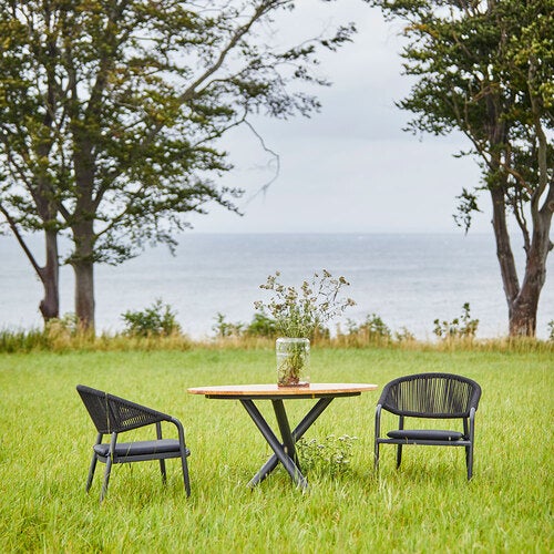 En komfortabel og moderne møbelserie i stilrent design fra Hillerstorp. Stolen er stabelbar og laget av aluminium med flettede UV-tau og sete trukket i tekstil. Pute i tekstil/quickdry. Bord av FSC®-merket kvalitetsbiff med elegante benstativ av antrasittgrå pulverlakkert aluminium.