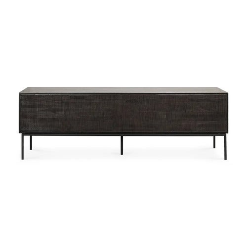 Grooves TV-benk fra Ethnicraft. Dette elegante møbelet er laget av mørkbeiset massiv teak og utstråler en sofistikert sjarm. Hver detalj på dørene er nøye håndskåret, noe som gir hver TV-benk en unik karakter og sjarm. Små ufullkommenheter fremhever møblets estetikk og gir det en autentisk følelse av håndverk.