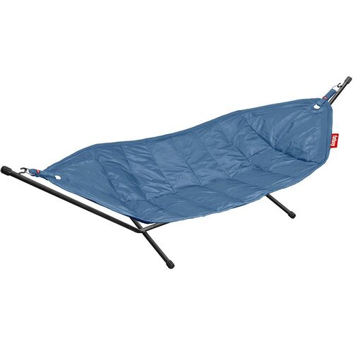 En hengekøye med stativ i svartlakkert stål. Den sjenerøse størrelsen på 140x280 cm gjør at flere personer kan ligge i den samtidig. (Maks 150 kg)