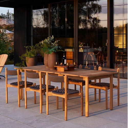 Koster-spisebordet er laget av teak av høy kvalitet og inspirert av de værbitte Kosterøyene. Den robuste konstruksjonen gjør det ideelt til både hverdag og fest, enten det er på en solrik terrasse eller i en forblåst hage.