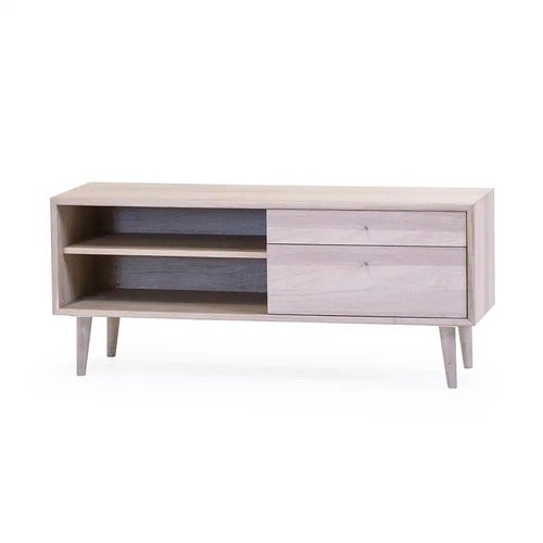 Nordik mediabenk i finert hvitoljet eik fra Torkelson. Benken har to selvlukkende skuffer og et åpent rom.