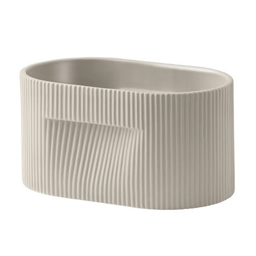 Ridge Planter er laget av høykvalitets steingods og har en matt, strukturert overflate, subtile ribbede detaljer og en glasert innside som skaper dybde og en organisk følelse. Diskrete håndtak på sidene gjør den enkel å flytte mellom rom, årstider og stiler.
