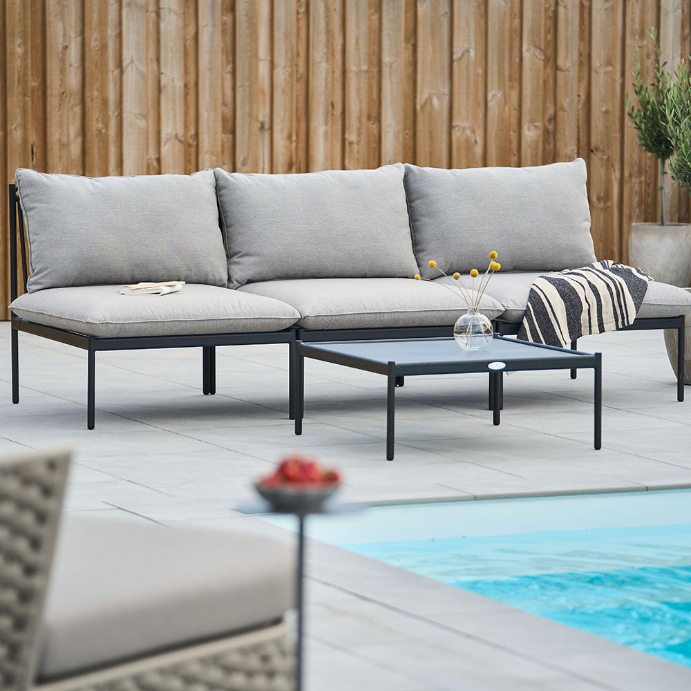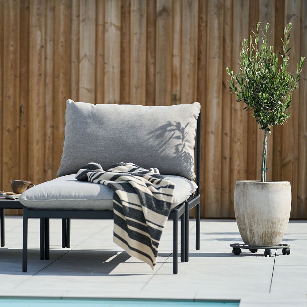 En moderne, stilren og vedlikeholdsfri modulsofa. Myke, runde profiler møter streng design med leken modularitet. Kan kombineres akkurat slik du ønsker med hjørnedeler, midtdeler, divaner og bord. Produsert i lakkert aluminium.